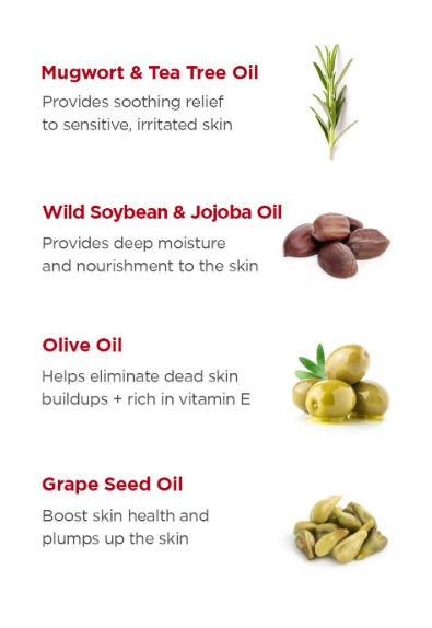 - Infused with calming herb extracts like Mugwort and Tea Tree