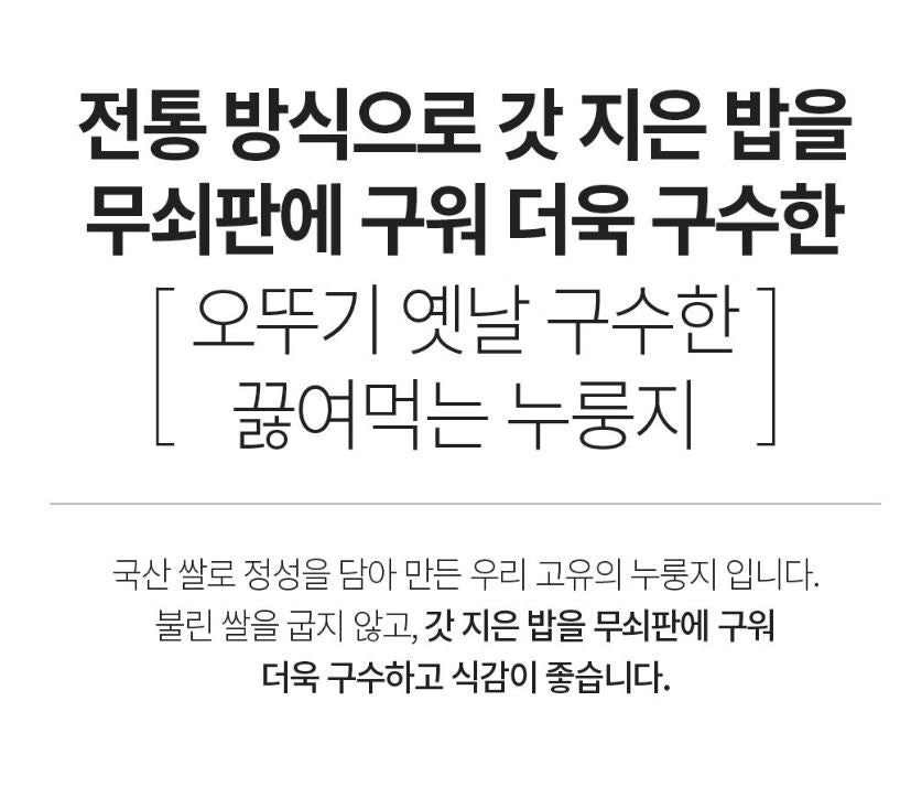 Inspired by classic home kitchens, this nurungji captures the familiar aroma of toasted rice from the bottom of the pot. When gently simmered, the rice crust releases a cozy, grain-forward flavor and a soft, porridge- like texture that feels comforting and unhurried—perfect for quiet meals at home.